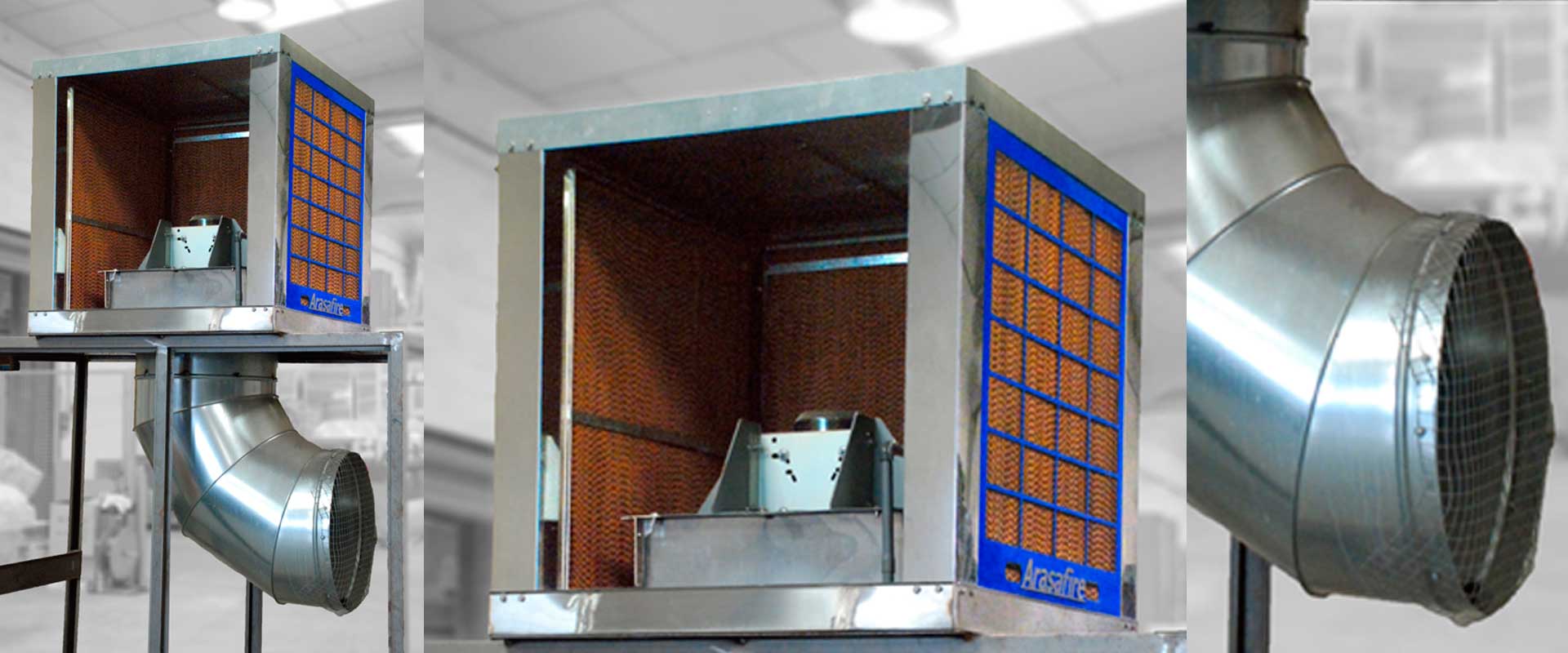 Nuestros equipos utilizan con total éxito la sencilla tecnología del enfriamiento evaporativo. Dicha tecnología viene dada por la evaporación de agua al pasar un volumen de aire determinado por unos paneles enfriadores que provocan una disminución de la temperatura del aire así cómo un aumento del grado de humedad del mismo.
